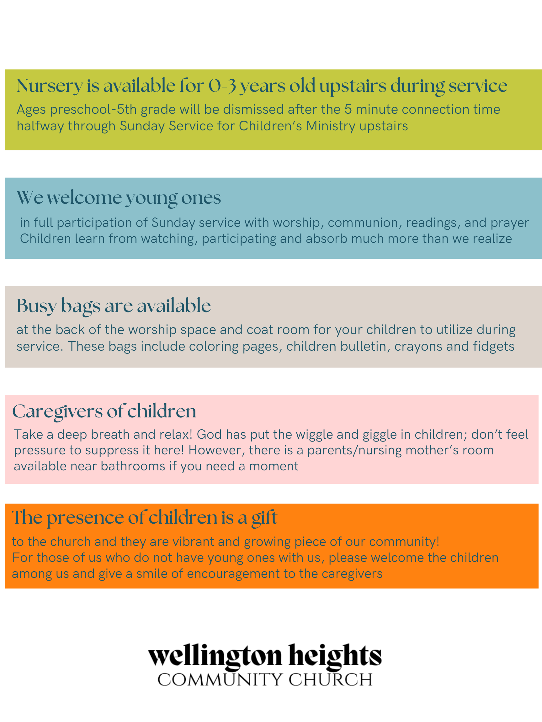 We are currently in need of Children’s Ministry volunteers! Please consider offering your time one Sunday per quarter, helping share the volunteer load among the families and attendees of WHCC to make this ministry sustainable for all involved. Your presence makes a meaningful difference in creating a welcoming, nurturing space for children.