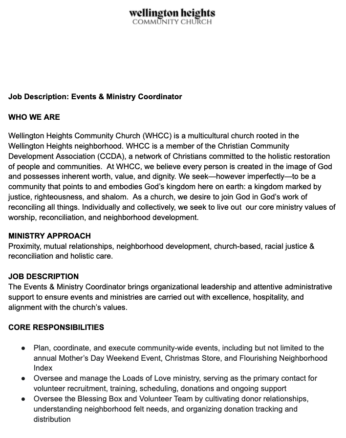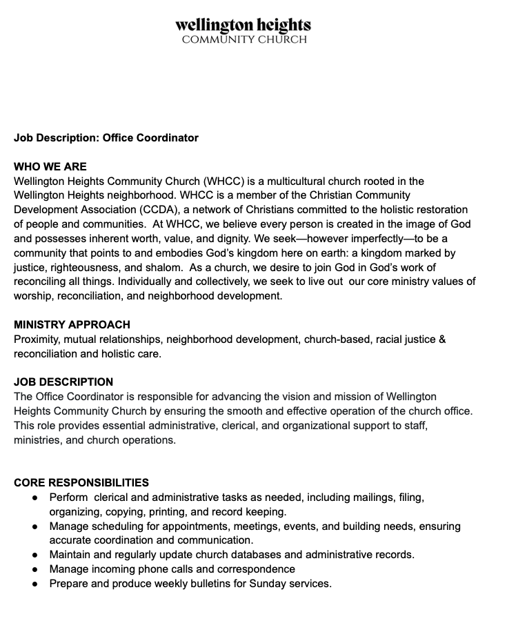 The Office Coordinator is responsible for advancing the vision and mission of Wellington Heights Community Church by ensuring the smooth and effective operation of the church office. This role provides essential administrative, clerical, and organizational support to staff, ministries, and church operations.
